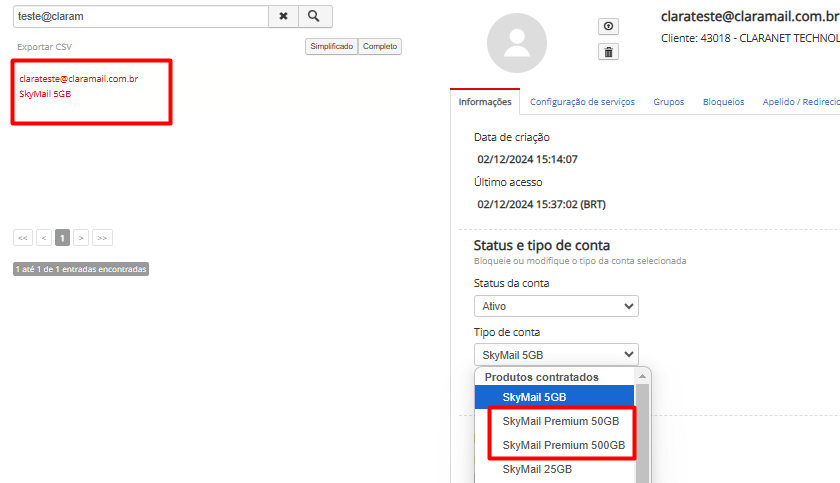 Este procedimento permite realizar upgrades ou downgrades em contas de e-mail.