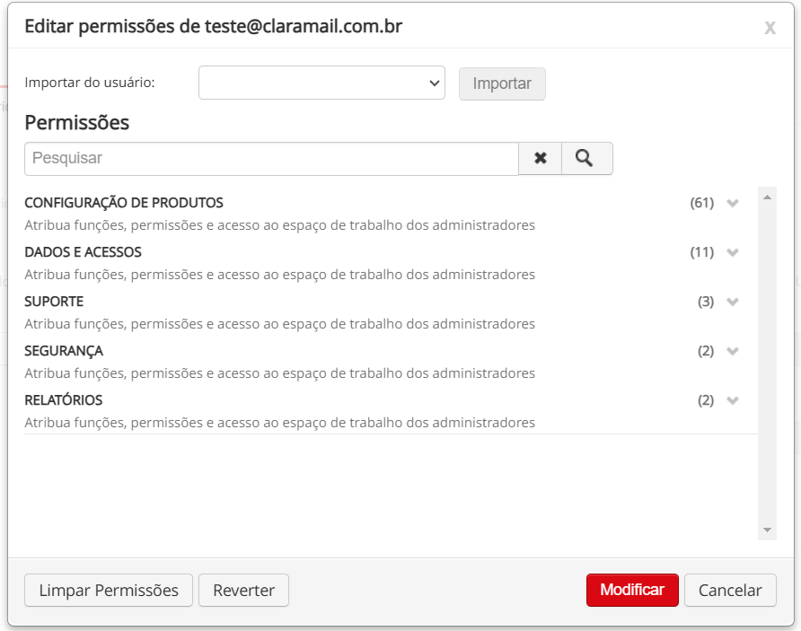 As Permissões disponíveis, são de acordo com a permissão que o usuário logado no painel possuir atualmente, ele não poderá conceder permissões acima das que tem.