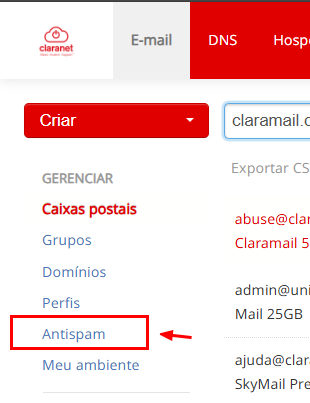 No canto superior esquerdo, clique em E-mail e em AntiSpam na sequência: