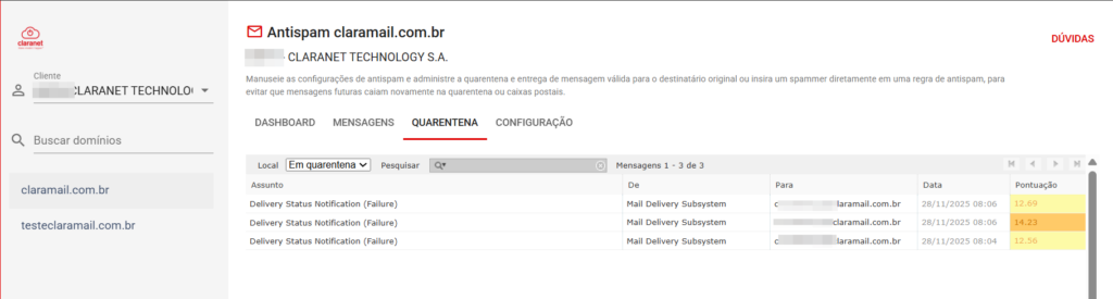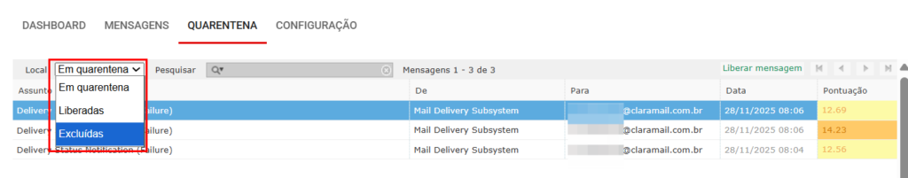 O painel irá exibir uma listagem de e-mails que se encontram em quarentena:
