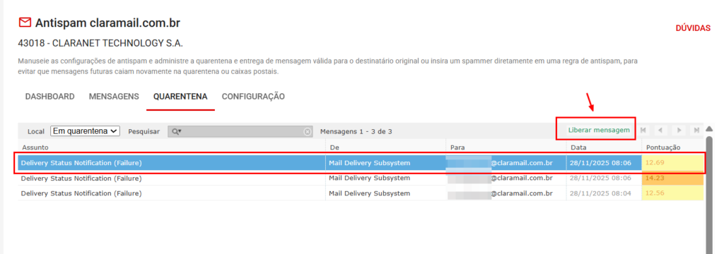 Quarentena – liberar mensagens no AntiSpam