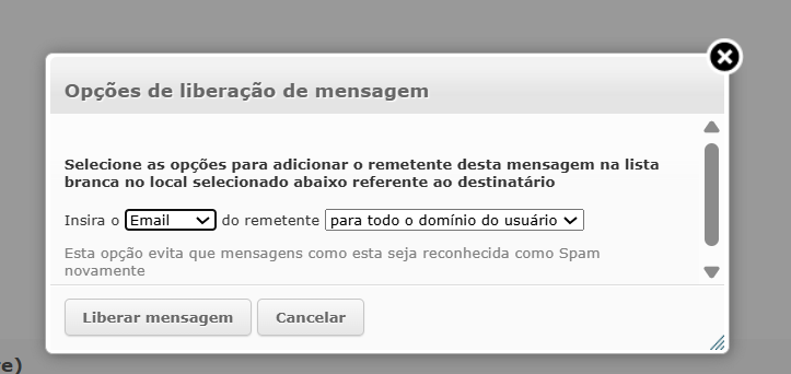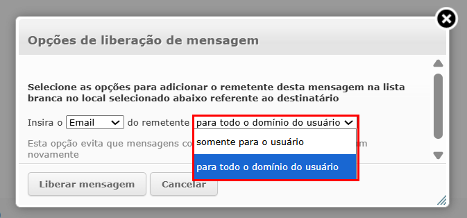 Escolha como deseja inserir o remetente na whitelist e clique em Liberar mensagem: